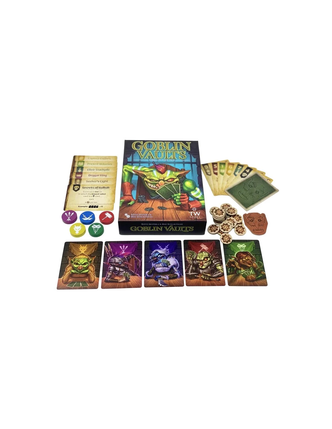 Goblin Vaults is a strategy card game for 1-5 players featuring bidding, card placement, and scoring patterns. In the game, you wager cards to win loot from the central cell block, then stash that loot wisely in your vault, earning gears based on the position of cards within that vault. You can also gain gears from scoring objectives that change each game.