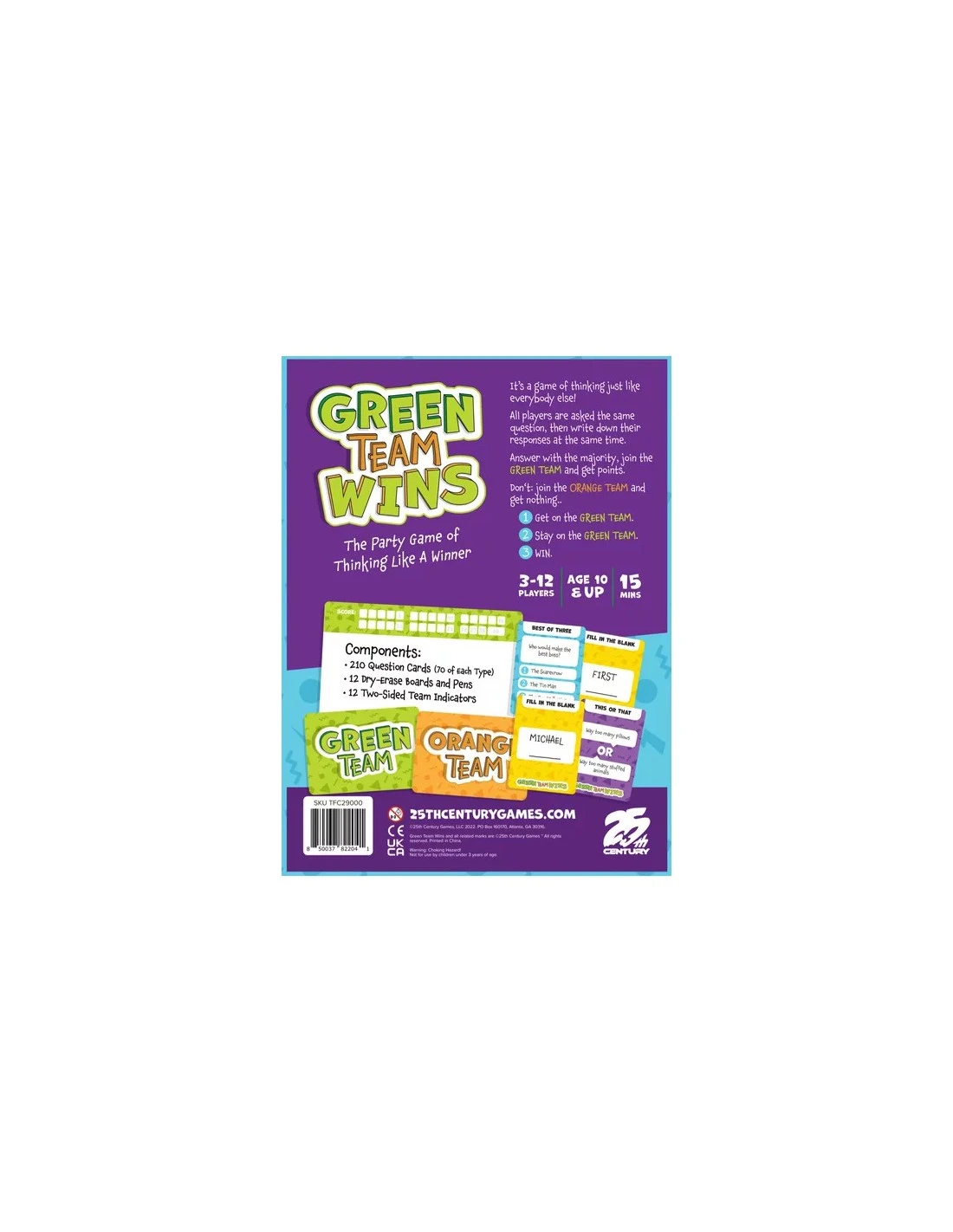 Everyone will be asked the same question, then writes down their responses at the same time. All players with the winning answer join the Green Team and score points. If your answer is not the most popular among the other players, then you join the Orange Team and score zero points for that round. Players joining the Green Team from the Orange Team will score one point. Players who are on the Green Team and stay on it will earn two points.