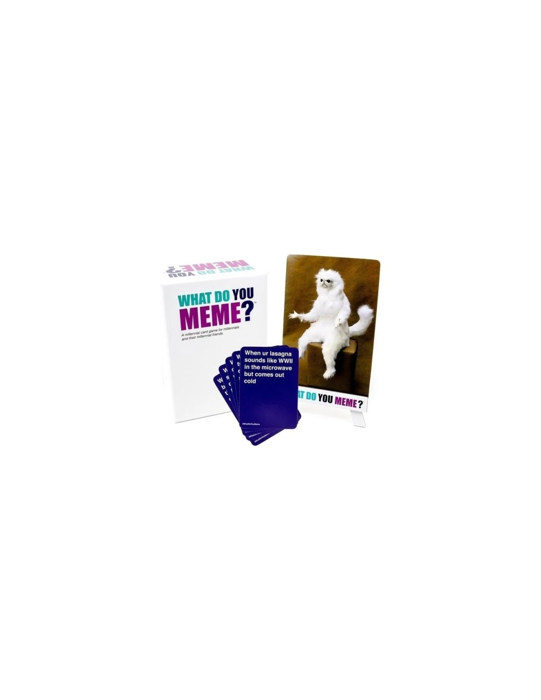 What Do You Meme? is a party card game for the social media generation. Each round, one player takes the role of judge and plays a photo card, after which everyone else plays a caption card to complete the meme. The judge decides the funniest pairing, and whoever played the winning caption card wins the round. Lather, rinse, and repeat.
