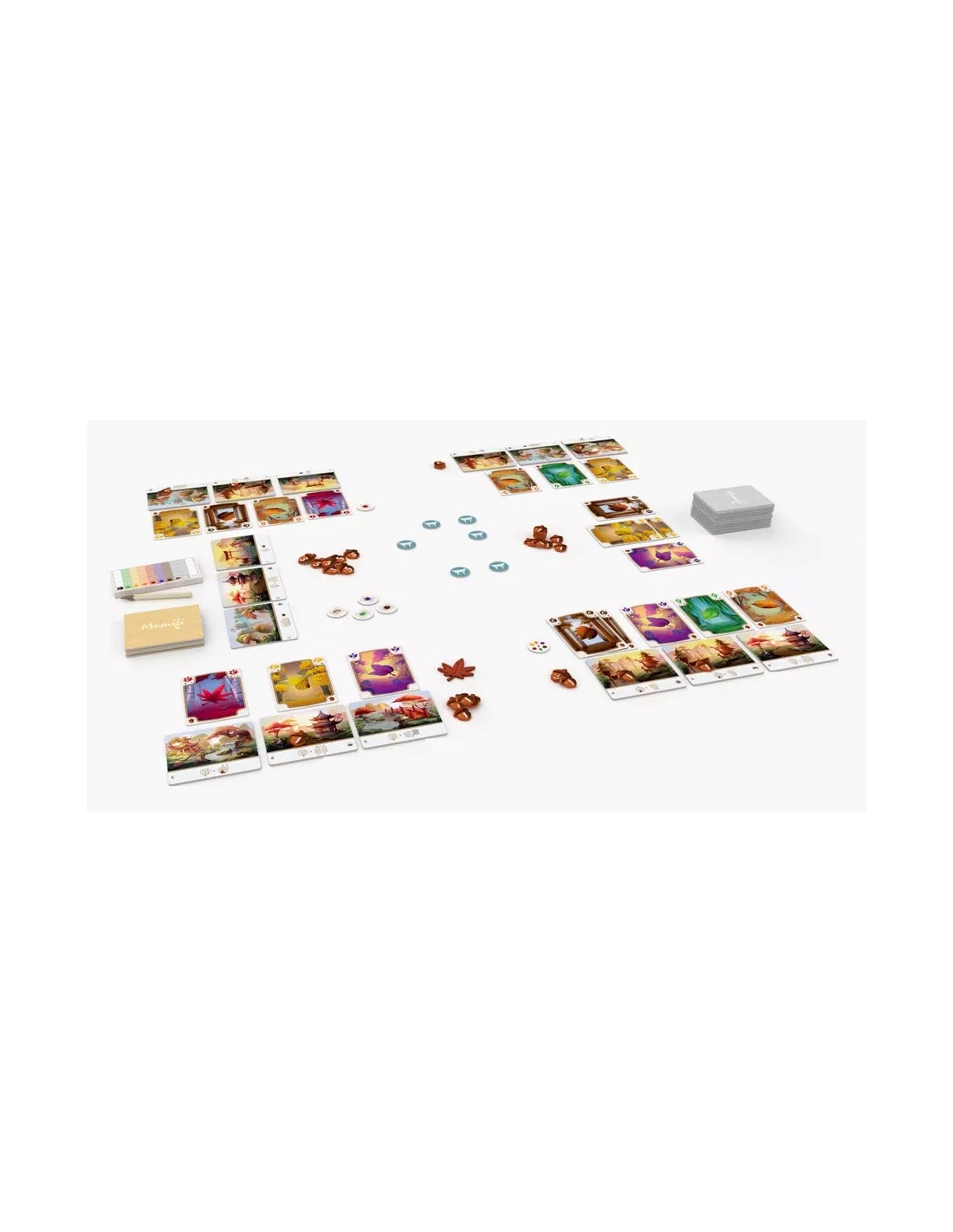 When the leaf card deck is empty or after 4-6 leaf piles are closed with a torii token, the game ends. For each pile of leaves, you score points equal to the value of the topmost card multiplied by the number of cards in the pile. Remaining acorn tokens are worth 1 point each. For each activated objective, you see who best meets the condition and therefore scores points; if the player holding the token scores, they receive 10 points, whereas anyone else who scores that objective receives 3 points. Each player scores in case of a tie. The player with the most victory points at the end of the game wins.