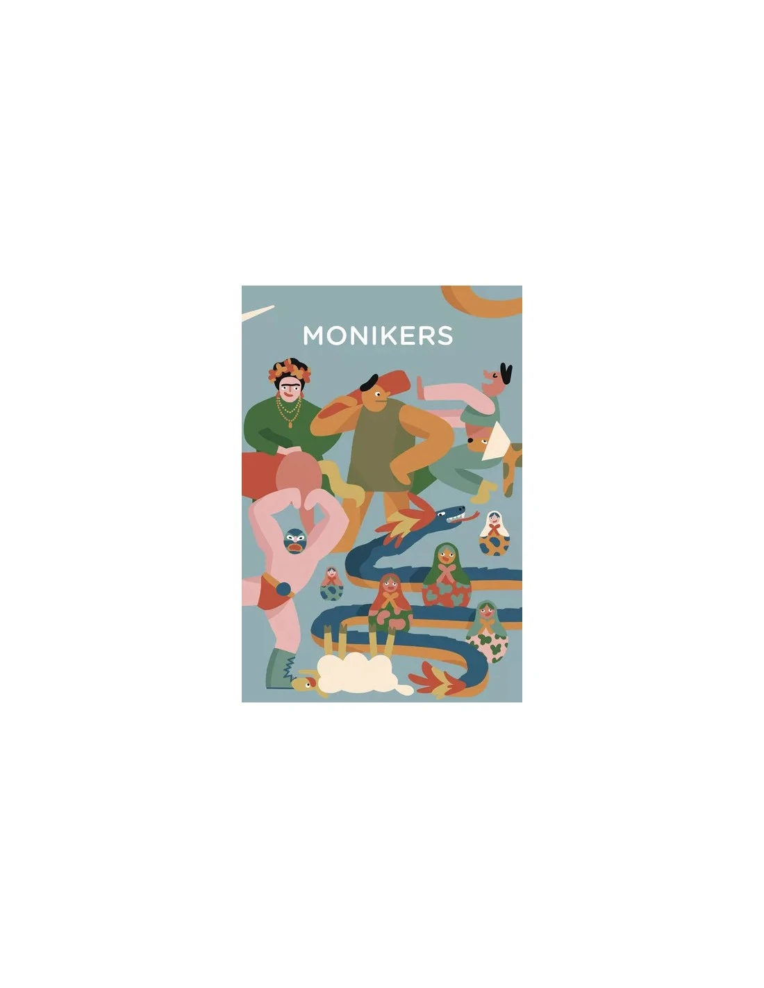 Monikers is a party game based on the public domain game Celebrity, where players take turns attempting to get their teammates to guess names by describing or imitating well-known people.