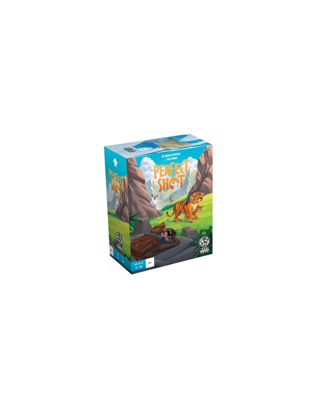 In Perfect Shot, you’ll have to take pictures of animals to win the most victory points. On your turn, you either take an Album card or you can place a Landscape punched card from your hand onto the previous Landscape card in the game shoe.
