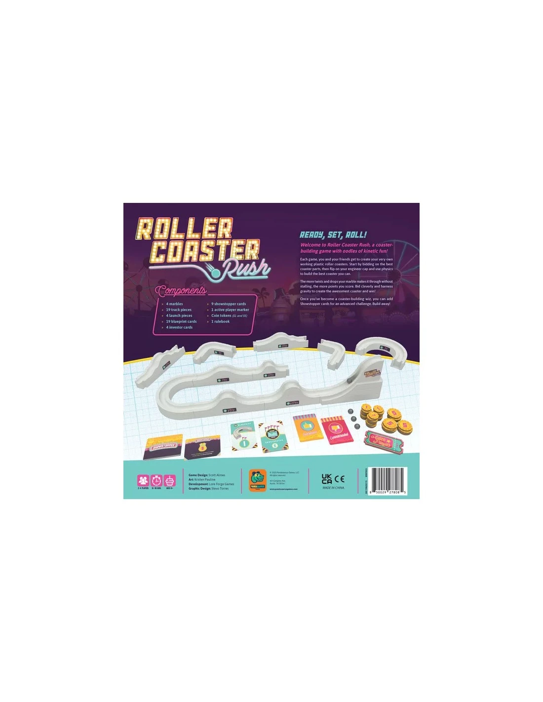 Welcome to Roller Coaster Rush, a coaster-building game with oodles of kinetic fun! Your goal is to design and construct the best roller coaster for your investors’ theme park! At the start of each game, you design a model coaster using the blueprints you have available. During the game, you’ll attempt to actually construct your model by winning auctions for the track pieces you used in your design.