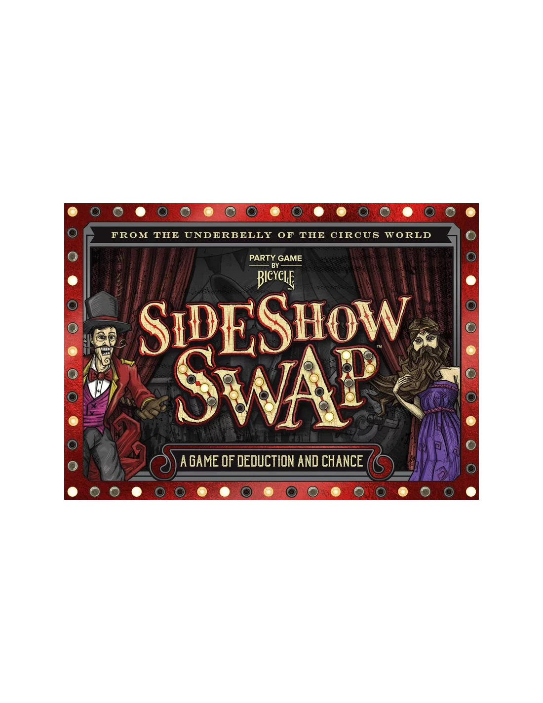 Sideshow Swap is an original, deduction-style party game based on cunning and chance. Players take turns swapping performer cards and playing tickets in an effort to sabotage others, all while trying to discover and hold the top performer before the game ends. Squirrel away money to play the best tickets and tilt the game in your favor. But beware! Other players are trying to ruin your plan as well, so it helps to keep track of where the best performers are as the chaos ensues. Cards are quickly and frequently changing between players, so you have to time your moves just right. The game ends when someone lays their last ticket, and players reveal their performers. The highest one wins!