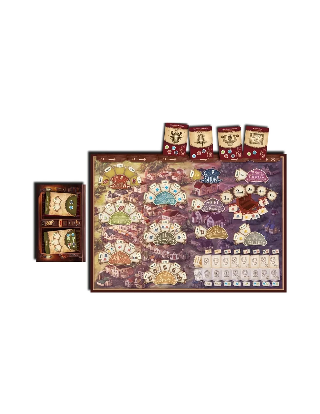 The game takes place over six days (rounds). At the start of each day, players prepare their schedules by booking time slots at locations around town, then the day’s events happen according to these schedules. Players will gather medicine and equipment, employ accomplices, bribe the police, and perform shows — but not all plans run smoothly. Other players will create stock shortages, steal your audience, and snatch up those essential time slots! Performing shows in related sets grants fame bonuses, as does getting your name in the local newspapers. Grave-robbing in the night damages your reputation, but earns cash! At the end of a busy week, the player who has earned the most fame wins.